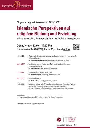 Das Fach Islamische Religion an öffentlichen Schulen in Niedersachsen war am 24. 09. Thema am Institut für Islamische Theologie (IIT) der Uni Osnabrück. Gemeinsam wurde diskutiert, wie das Fach Islamische Religion besser ausgebaut werden kann, um mehr muslimischen Schülerinnen und Schülern in Niedersachsen islamischen Religionsunterricht an öffentlichen Schulen anbieten zu können.