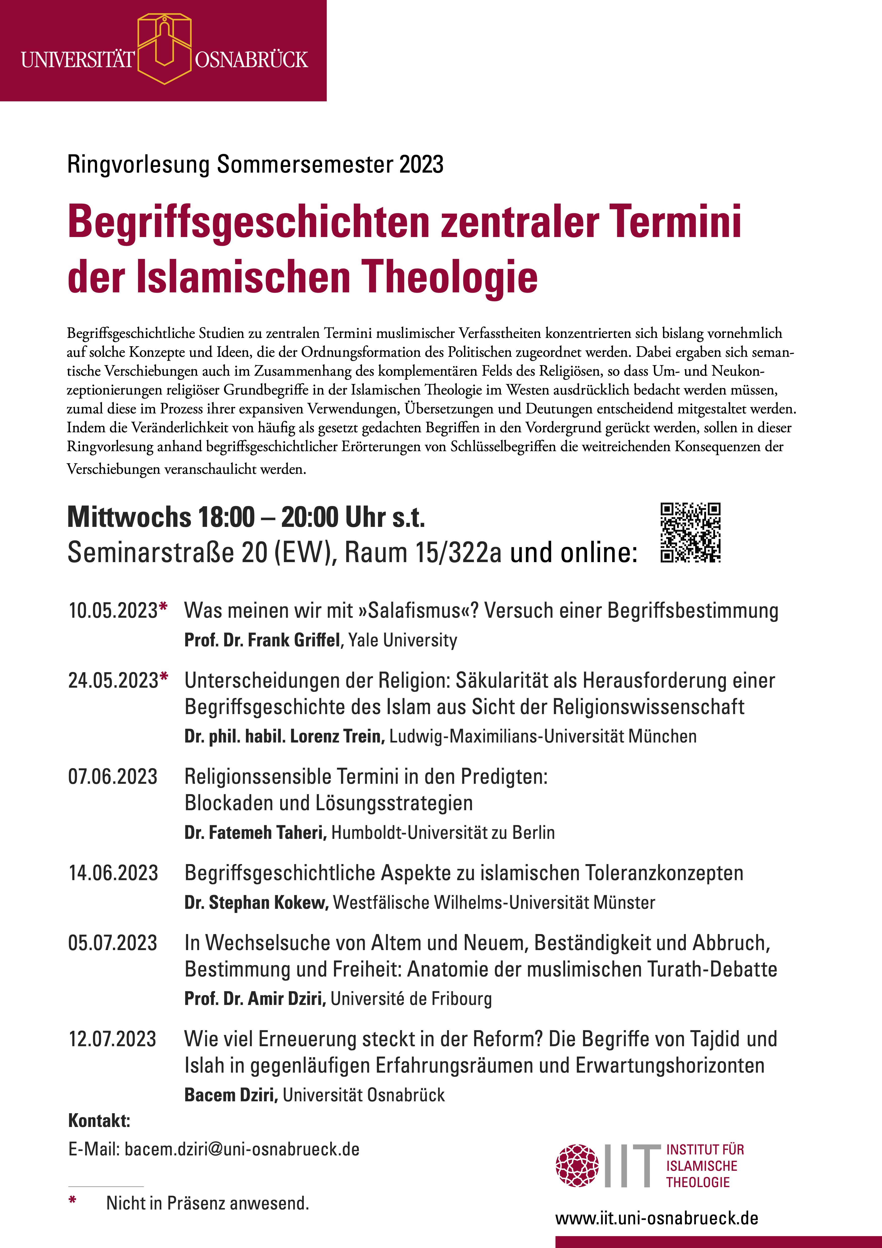 Begriffsgeschichtliche Studien zu zentralen Termini muslimischer Verfasstheiten konzentrierten sich bislang vornehmlich auf solche Konzepte und Ideen, die der Ordnungsformation des Politischen zugeordnet werden. Dabei ergaben sich semantische Verschiebungen auch im Zusammenhang des komplementären Felds des Religiösen, so dass Um- und Neukonzeptionierungen religiöser Grundbegriffe in der Islamischen Theologie im Westen ausdrücklich bedacht werden müssen, zumal diese im Prozess ihrer expansiven Verwendungen, Übersetzungen und Deutungen entscheidend mitgestaltet werden. Indem die Veränderlichkeit von häufig als gesetzt gedachten Begriffen in den Vordergrund gerückt werden, sollen in dieser Ringvorlesung anhand begriffsgeschichtlicher Erörterungen von Schlüsselbegriffen die weitreichenden Konsequenzen der Verschiebungen veranschaulicht werden.