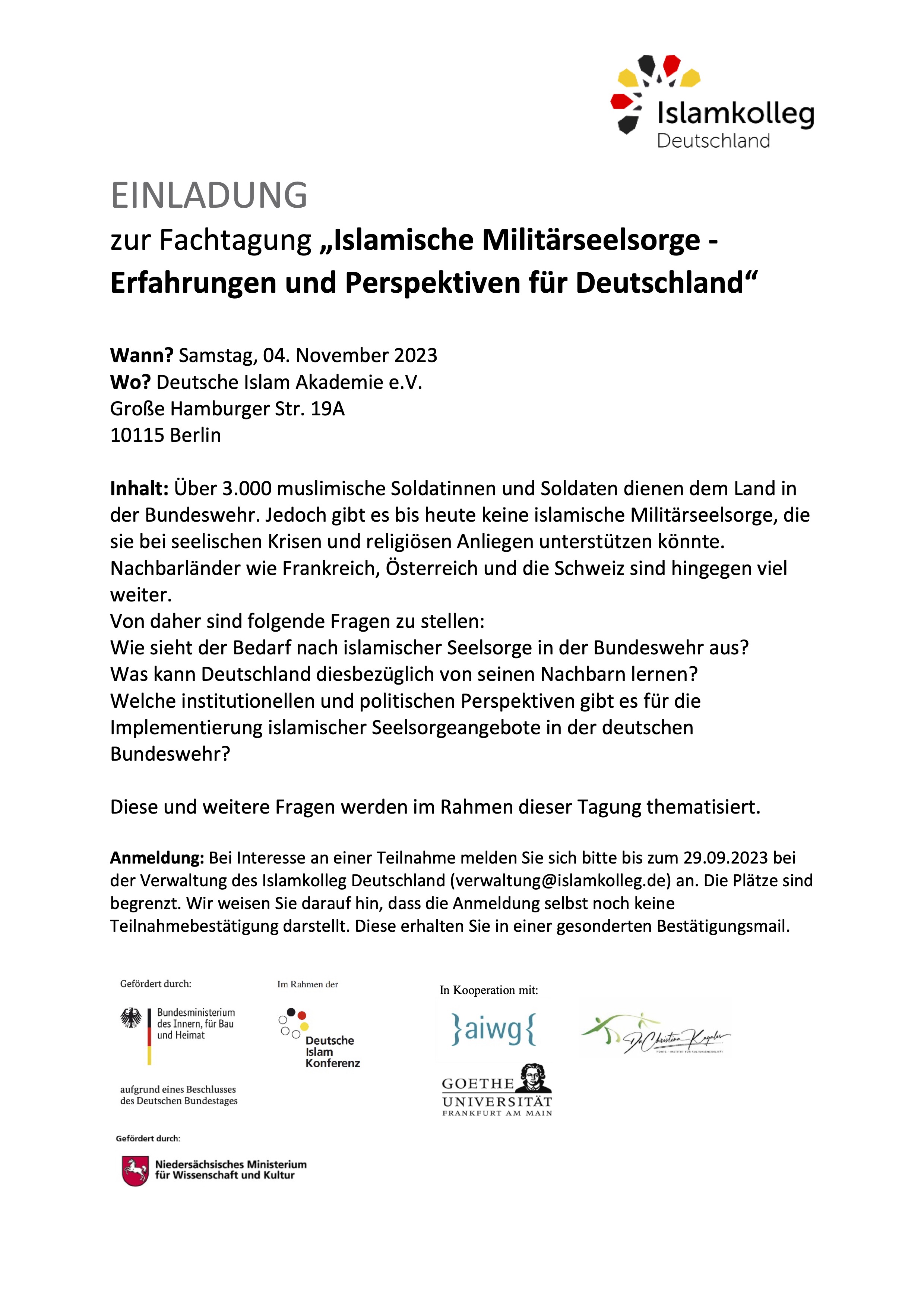 Einladung zu einer Fachtagung des Islamkolleg Deutschland (IKD) zur Islamischen Militärseelsorge in Berlin am 04. November 2023
