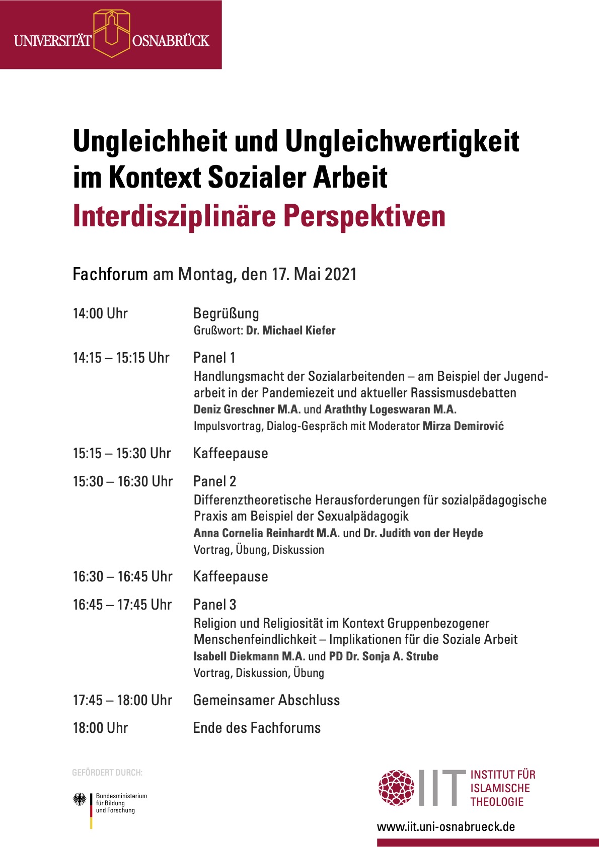 - 01.10.2020 | Zum Status Quo muslimischer Wohlfahrtspflege in Deutschland. Grundlagen – Bestandsaufnahme – Gelingensbedingungen. Podiumsdiskussion des Instituts für Islamische Theologie an der Universität Osnabrück