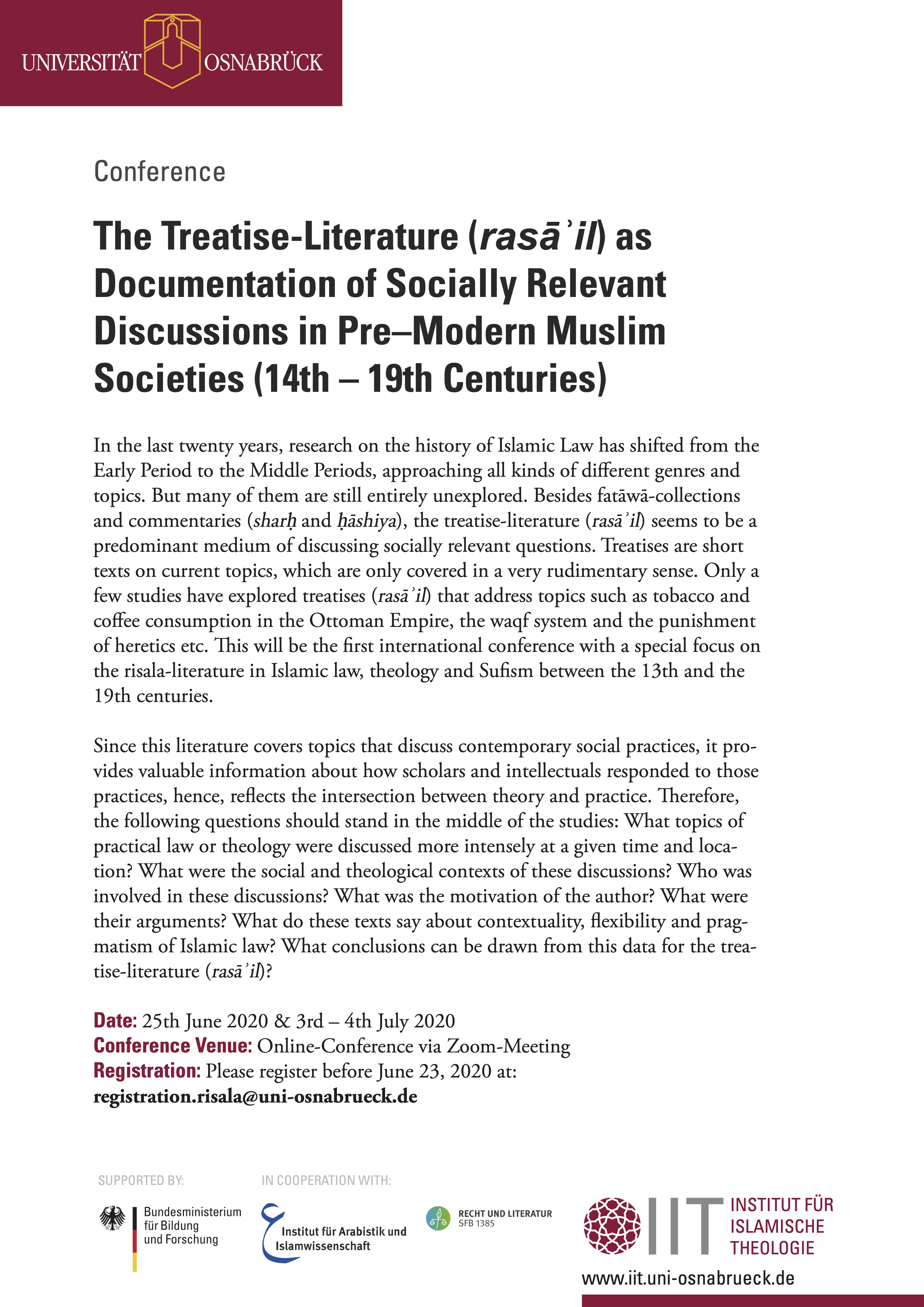 - 25.06./03.-04.07.2020 | The Treatise-Literature (rasāʾil) as Documentation of Socially Relevant Discussions in Pre–Modern Muslim Societies (14th – 19th Centuries). Tagung des Instituts für Islamische Theologie an der Universität Osnabrück