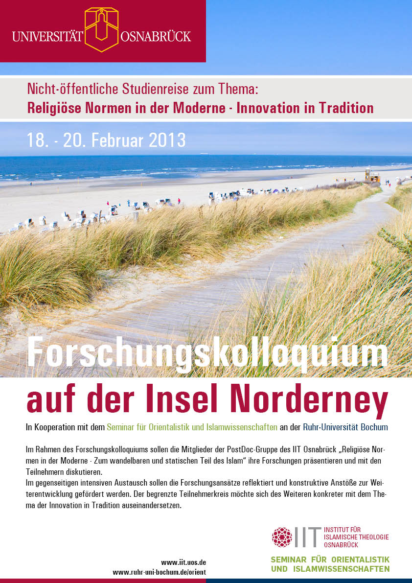 - 18.-20.02.2013 | Religiöse Normen in der Moderne - Innovation in Tradition. Forschungskolloquium auf der Insel Norderney in Kooperation mit dem Seminar für Orientalistik und Islamwissenschaften an der Ruhr-Universität Bochum.